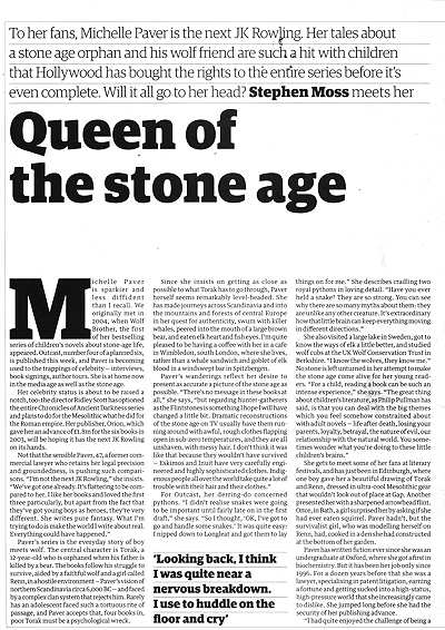 Michelle Paver is sparkier and less diffident than I recall. We originally met in 2004, when Wolf Brother, the first of her bestselling series of children’s novels about stone-age life, appeared. Outcast, number four of a planned six, is published this week, and Paver is becoming used to the trappings of celebrity – interviews, book signings, author tours. She is at home now in the media age as well as the stone age.